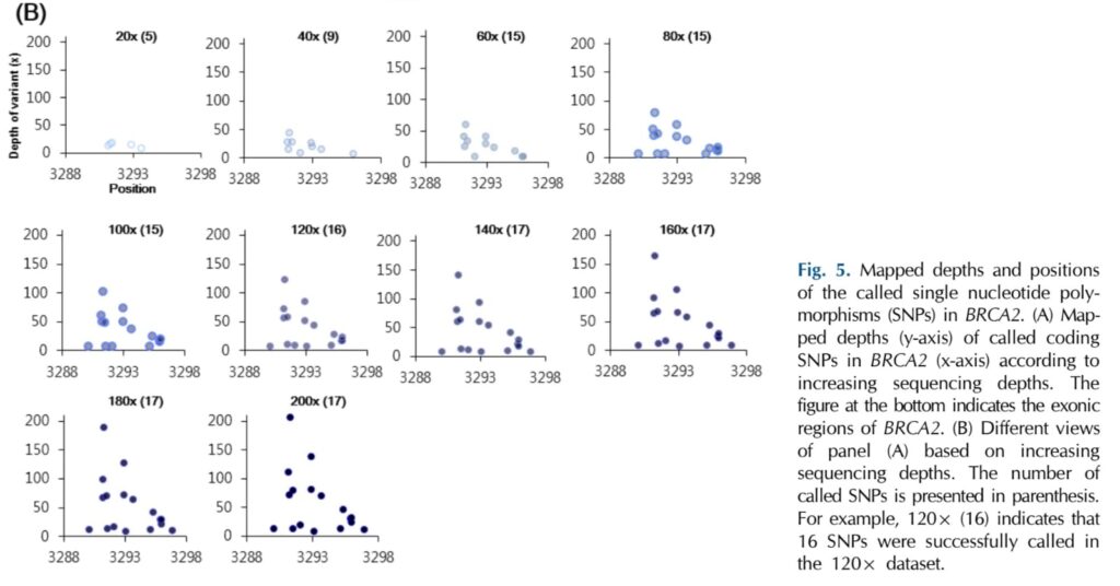 * BRCA1 ve BRCA2 Analizi: Meme kanseri için majör risk faktörleri olan BRCA1 ve BRCA2 gibi kritik genler üzerinde yapılan detaylı incelemeler de bu bulguyu desteklemektedir. BRCA2 genindeki çoğu SNP, 100x derinliğe ulaşıldığında belirlenmiş ve 140x derinlikten sonra yeni SNP tespit edilmemiştir. Sadece haritalanmış okuma derinlikleri artmıştır. Bu durum, 100x ortalama derinliğin, yüksek penetranslı hastalık genlerindeki tanısal varyantların tespiti için yeterli olduğunu göstermektedir.